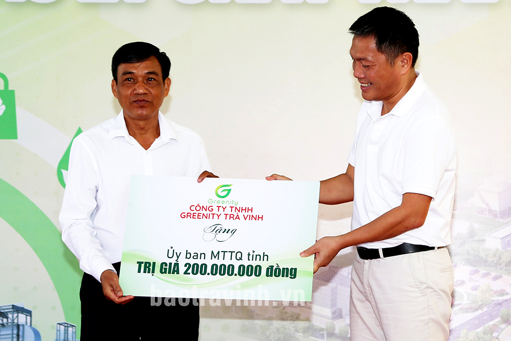 Đồng chí Kiên Banh (bên trái), Phó Chủ tịch UBMTTQ Việt Nam tỉnh nhận bản tượng trưng 200 triệu đồng từ ông Nguyễn Tiến Nga, Giám đốc Công ty TNHH MTV Greenity Trà Vinh.